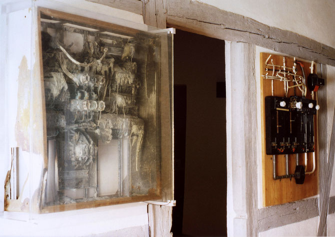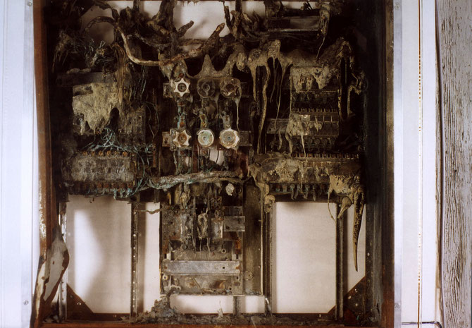 "Blackout", geschmolzener Sicherungskasten, aus der Distanz gesehen, Waiblingen 2003
