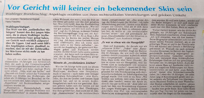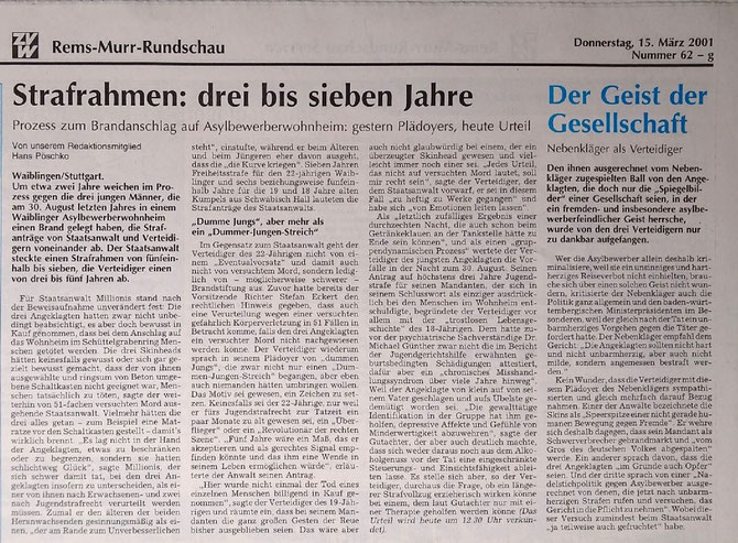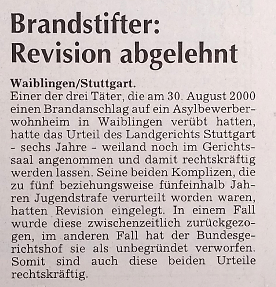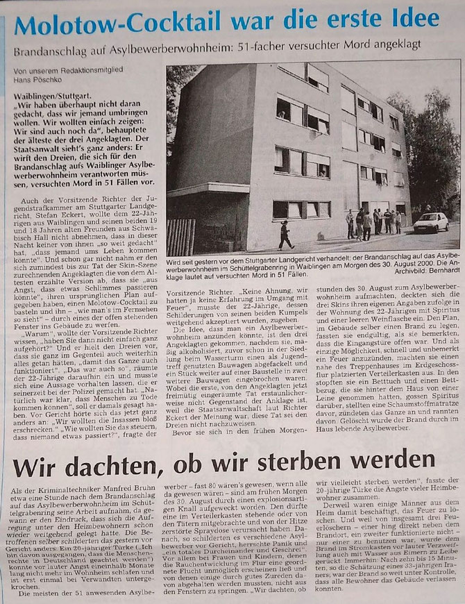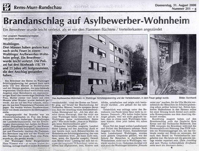 Waiblinger Kreiszeitung vom 31. August 2000 zum Anschlag am 30.8.2000 auf das Asylbewerber-Wohnheim am Schüttelgrabenring.