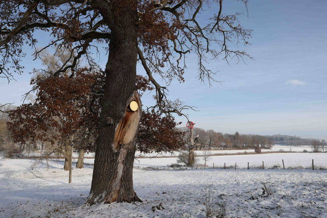 Ein runder goldener Glanz im oberen Teil der Baumwunde, ein Strahlen, ein schwebendes Relikt, fällt dem aufmerksamen Betrachter ins Auge. Man kann es als Nimbus verstehen, als Gloriole, als Heiligenschein Die Meisten werden es im Vorbeischlendern oder -Radeln übersehen.